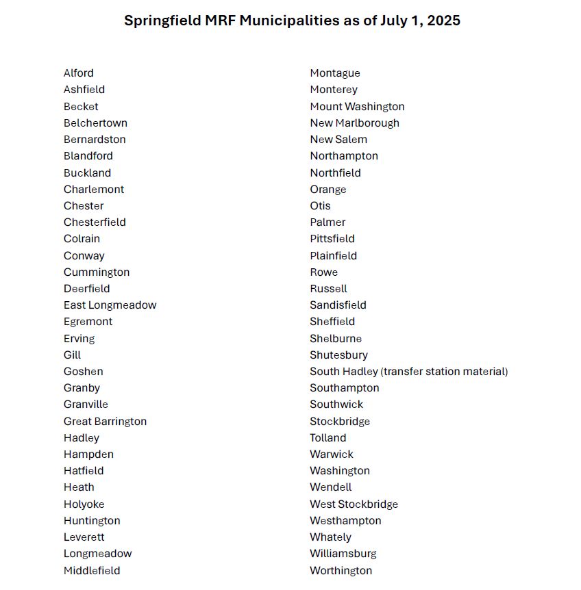 Local Info The Springfield Materials Recycling Facility (MRF) accepts recyclables from 62 of the 100 municipalities in western Mass.